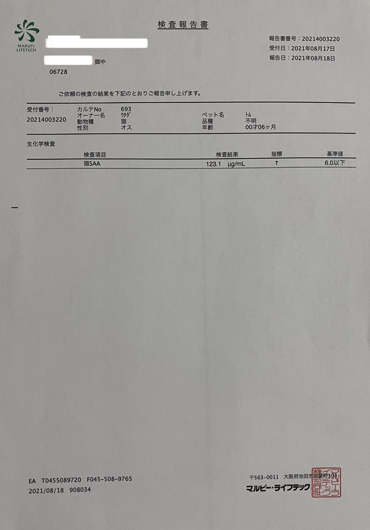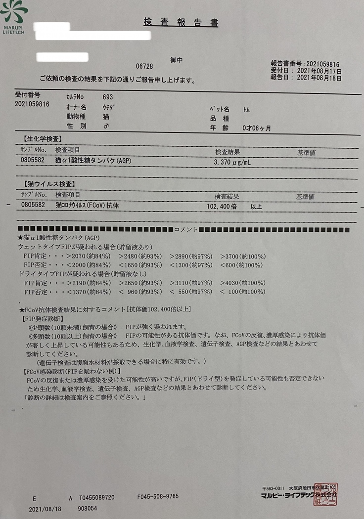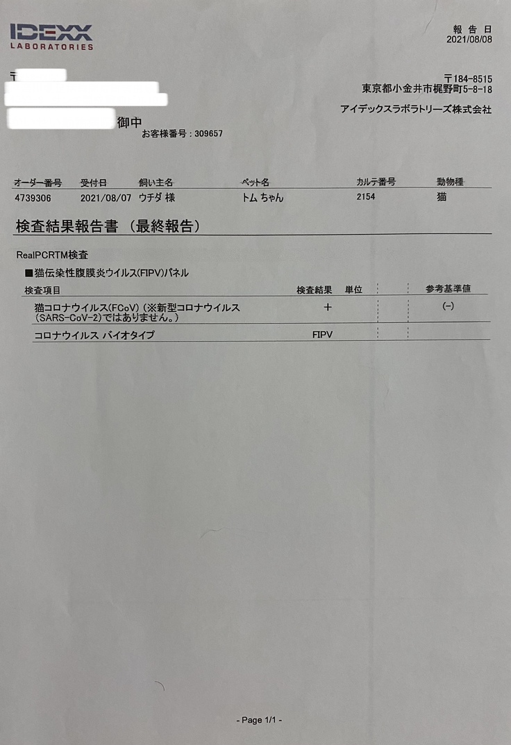 未承認薬を頂いてる病院での猫コロナウイルスの検査結果が届きFIP陽性が確定しました。