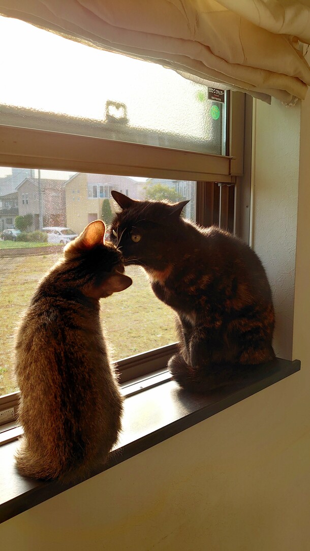 今朝は、天気がよく朝日が入る窓で、長女猫とイチャイチャするちからくんを激写しました。