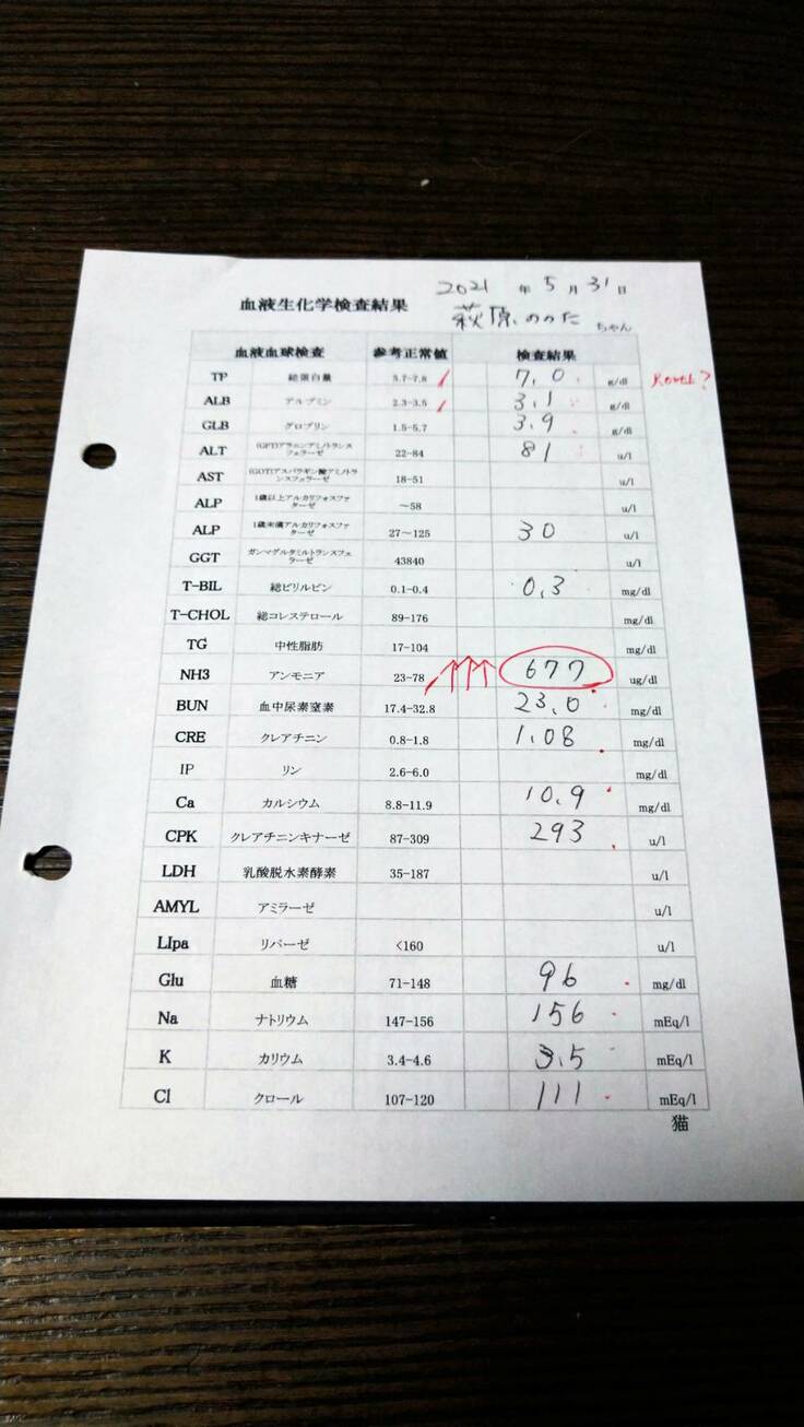 アンモニアの参考正常値が23~78のところ、ののたは677という飛び抜けた数値でした。