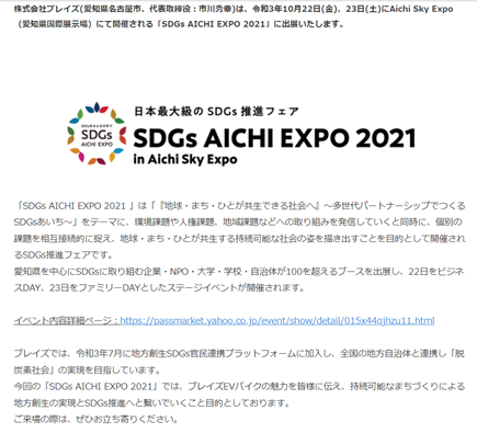 EVモビリティメーカー株式会社ブレイズが「SDGs AICHI EXPO 2021 」に出展します!|株式会社ブレイズのプレスリリース (prtimes.jp)