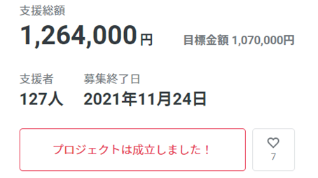 おかげさまで、目標金額を達成することが出来ました。応援、ご支援くださった皆様たいへんありがとうございました。「成立」というタグがついて一安心です。まだ23時過ぎ、興奮が冷めませんが、明日も早起きで仕事ですから早く寝ましょう!改めて、感謝お礼メールでご報告させていただきます。