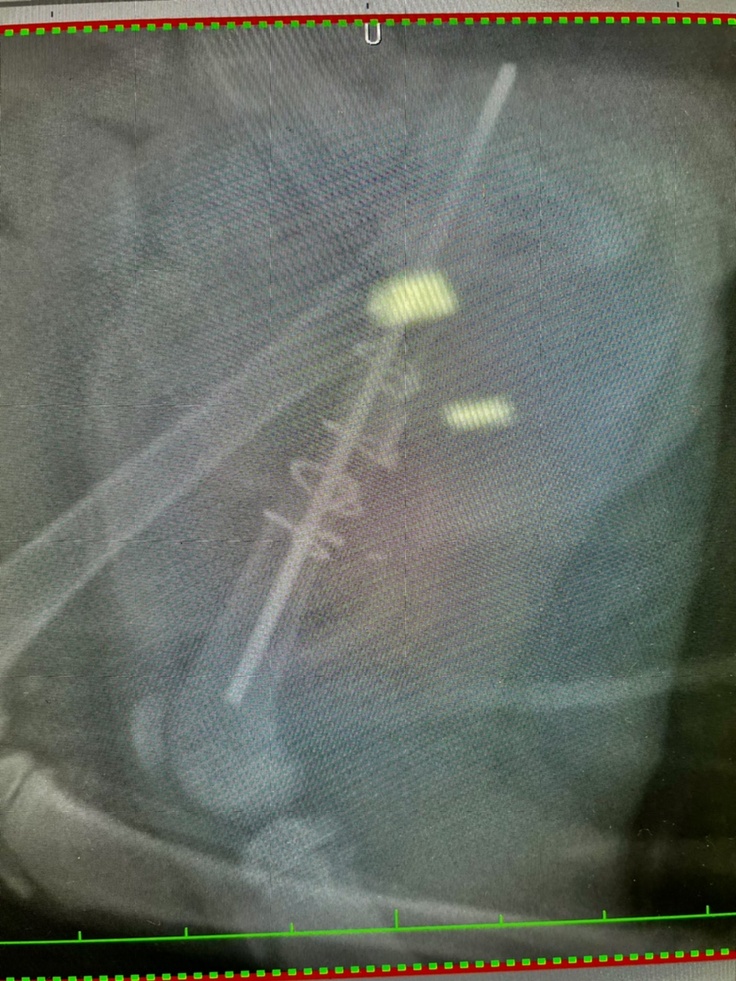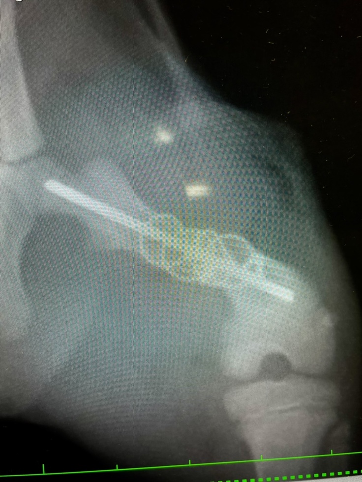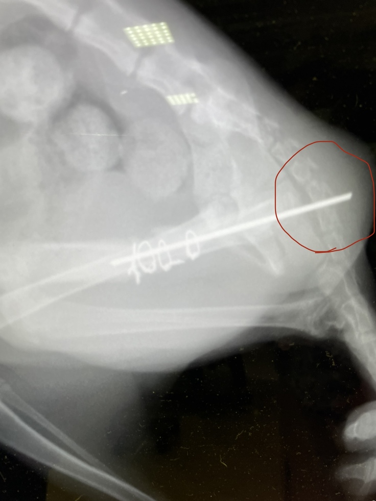 ピンが皮膚を突き破りそうなため、摘出を行いました。幸い抜き取る事が出来たので、切開も小さい範囲で済みました。ワイヤーは残したままです。