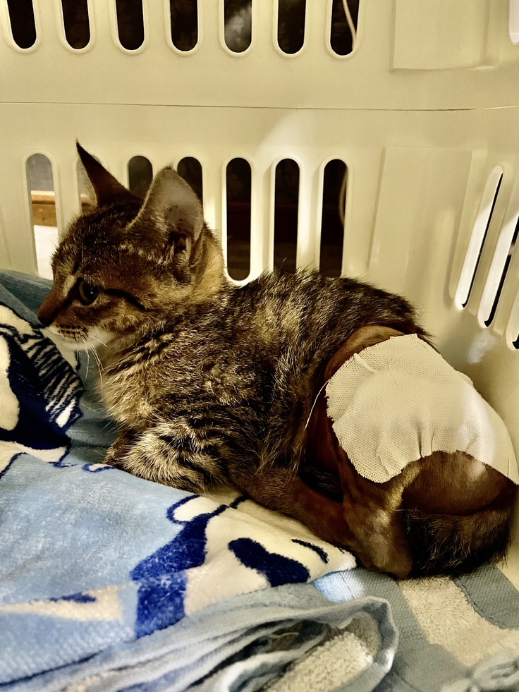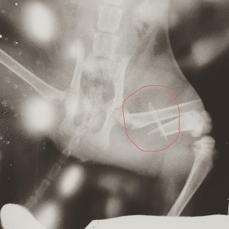 レントゲンの結果、左後脚大腿骨が3つに分かれていました。普通の骨折ではなく、粉砕骨折を患い、また腰骨も負傷している可能性があり、4本の足で立つことすら難しい状態でした。左後脚は力が入らず、ぶら下がってました。左後脚は手術が必要とのことで、すぐ手術の段取りをしました。