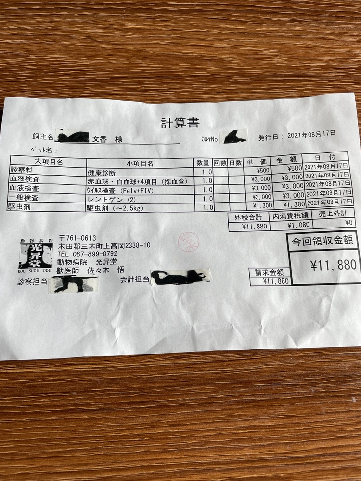 ※保護して数時間後に動物病院へ行った為、この時はまだ名前が決まっていなかったのでペット名は空白です。