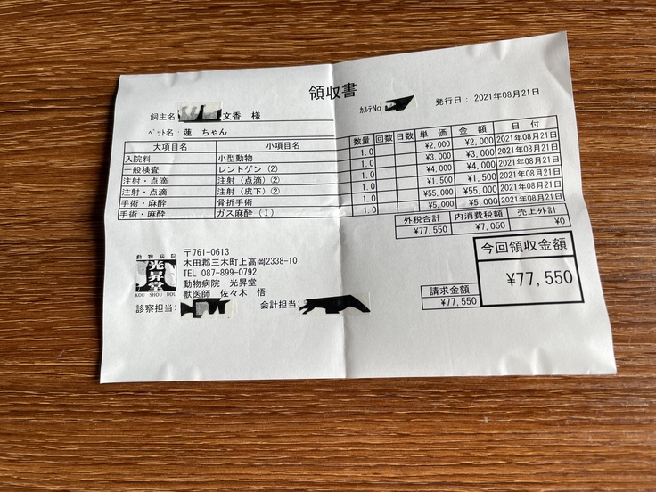 本来であれば8/28受診予定でしたが、動物病院が急遽8/24〜8/30まで臨時休診となりました。8/31より診療再開したので受診し、抜糸を行い、レントゲンを撮りました。