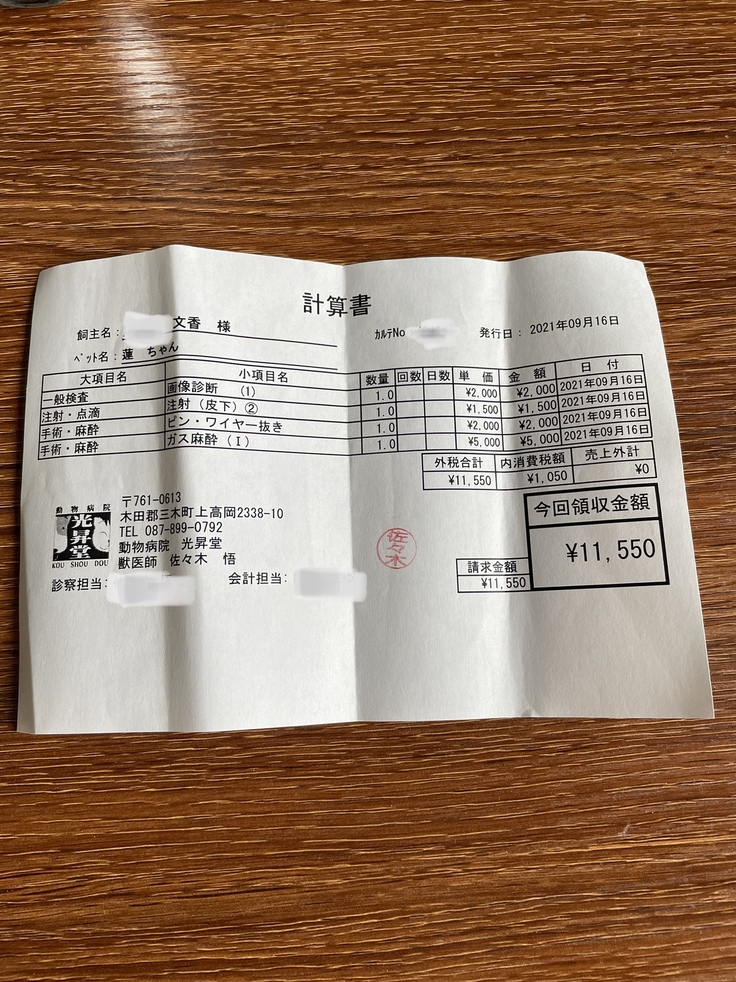 8月20日に無事に手術が終わり、8月21日に退院しました。ステンレスのピンとワイヤーで骨を固定しています。服薬は難しいとのことで2週間効果が続く抗生剤の注射を退院時に接種しています。