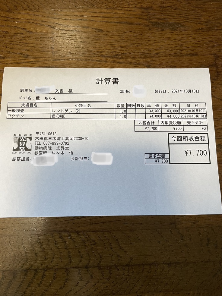 怪我の治療もひと段落したのでワクチン接種1回目も行いました。次回の受診は11月10日になります。そのときにワクチン接種2回目、マイクロチップ、避妊手術を行うため入院予定です。