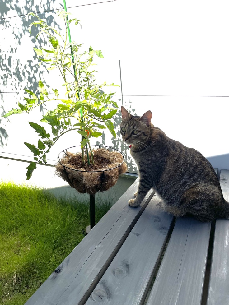 写真は中庭で育ててるトマトに興味津々の蓮です。
