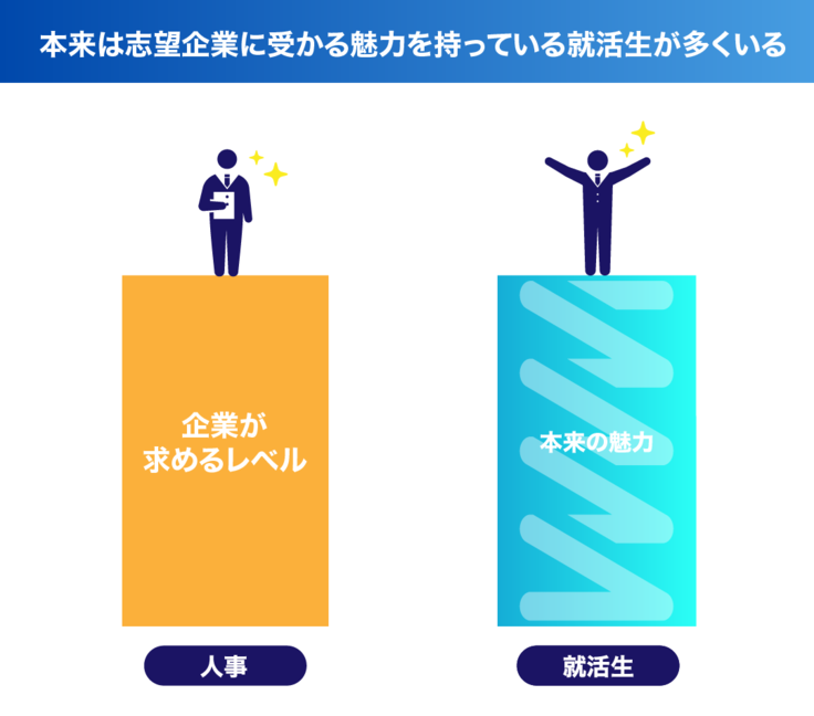 今の就活面接では、本来受かるほどの魅力をもった就活生が、面接本番で魅力を発揮できず、「テクニック」で魅力を大きく見せているだけの就活生に負けている現状があります。