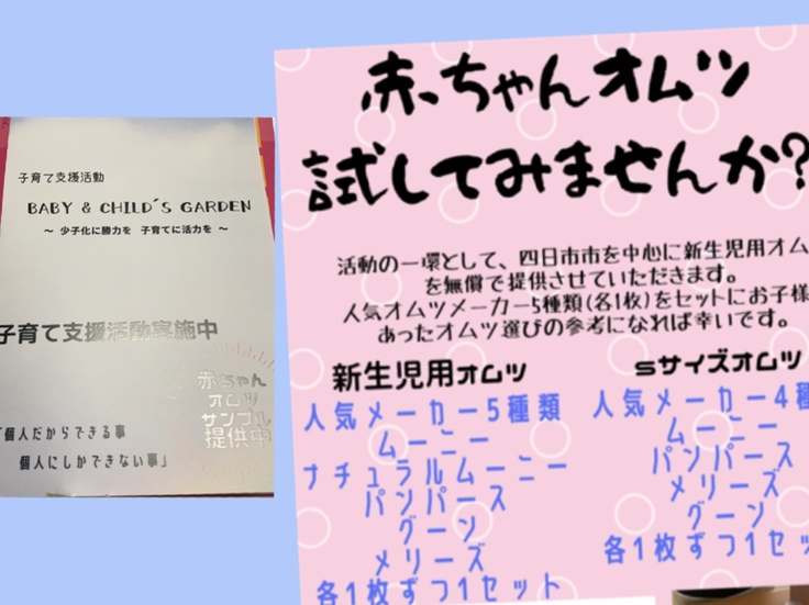 子育てに少しでもお役に立てるよう地元を中心にオムツのお試しセットを無償で提供したりしています。