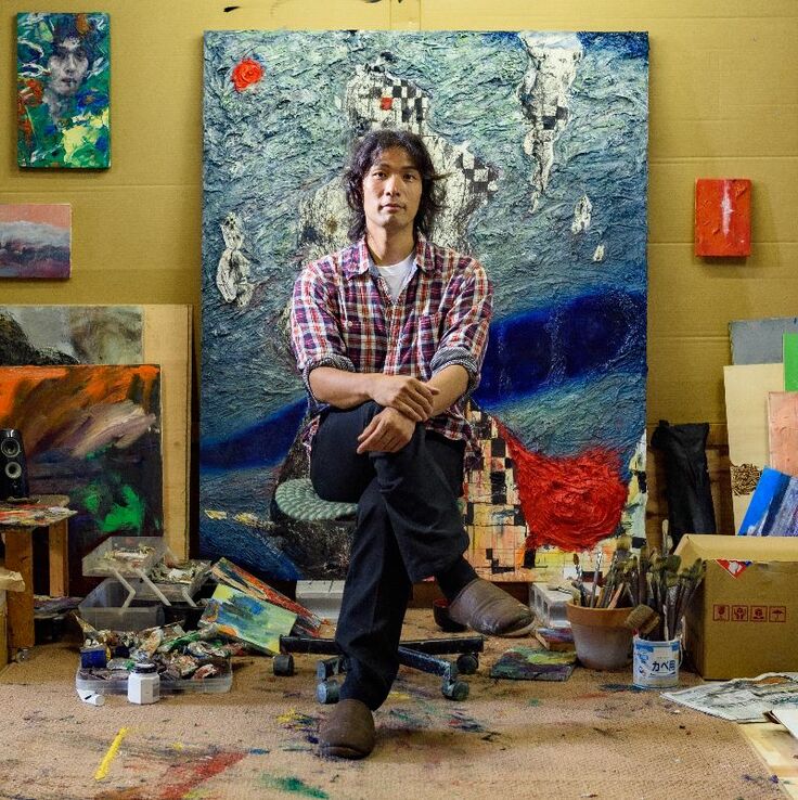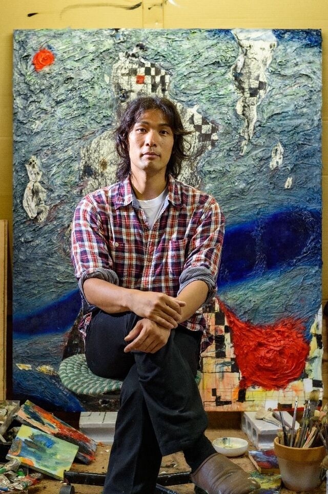 農画家 上林泰平 【プロフィール】 1986年生まれ、長野県南信地域在住。革製品デザイン製作所「たいへいクラフト」店長。二科会長野支部長。小学生の頃から高校時代に通っていたアート塾を始まりに絵を描き始め、創作活動を20年以上に渡り続けている。山をこよなく愛し、山荘での10年間の勤務経験や、長野県南信地域でのりんご農家としての顔も持ち合わせる。受賞歴多数。