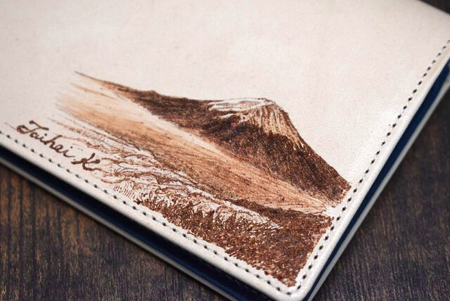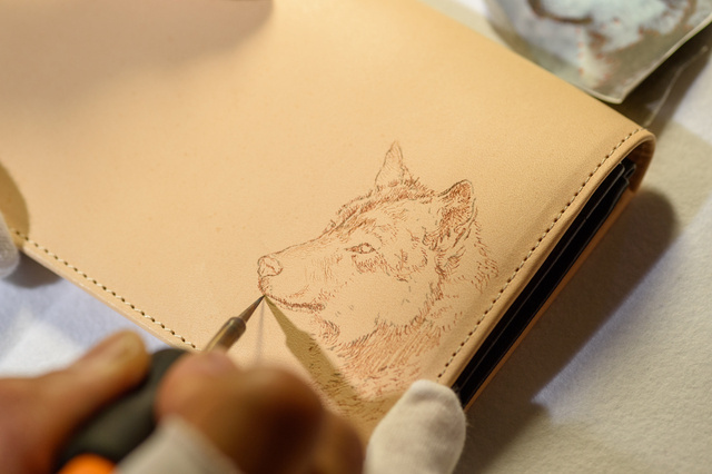 バーニングアートの魅力を引き出す為、表革は優しいナチュラルレザーで統一しました。インナーは3色からお選び頂けます。(ブラック・ブルー・グリーン)