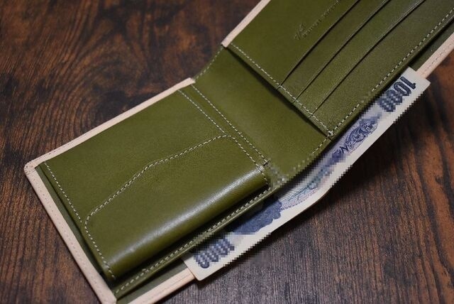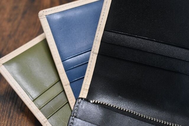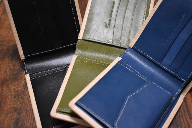 スマートに持つことができるシンプルな2つ折り財布です。インナーは3色からお選び頂けます。(ブラック・ブルー・グリーン)