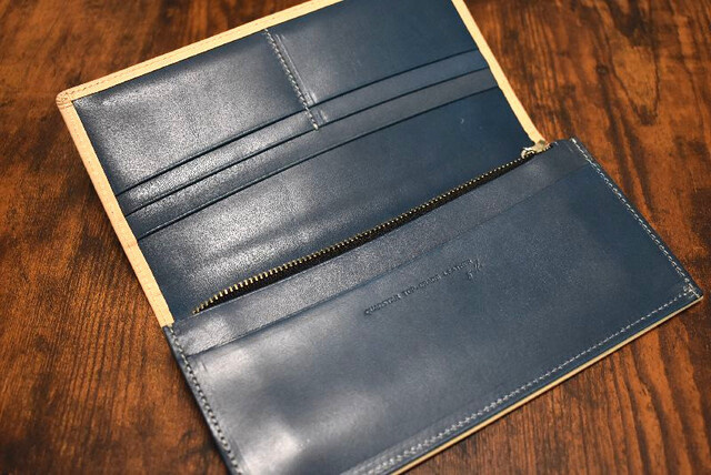 ナチュラルとインナーカラーの相性も良いです。ヘリ返しも大変美しくどちらのレザーも経年変化で深みを増していくでしょう。。