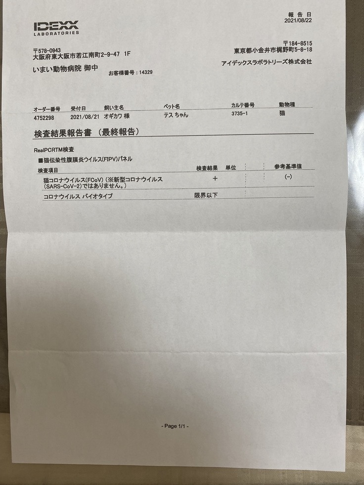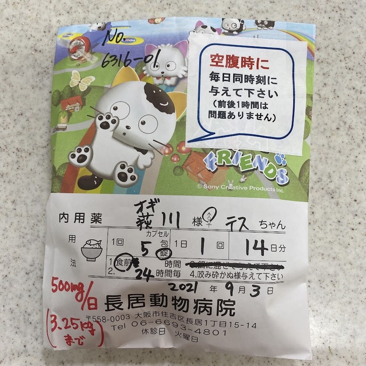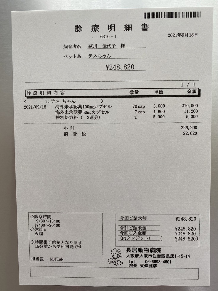 資金は全てテスの治療費に充てさせていただきます。証明として2週間ごとに病院にてFIPのお薬が処方されるので、その証明書を都度掲載します。