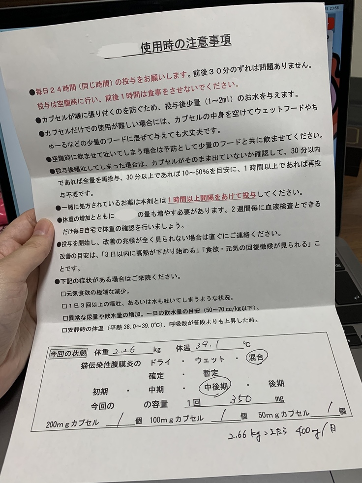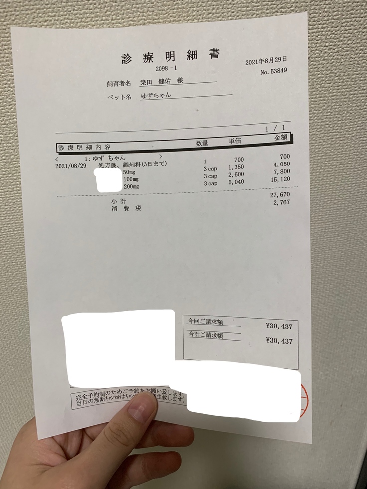 ゆずちゃんは臓器に腫瘍のできるドライタイプと腹水のたまるウェットタイプの混合タイプのため、1日の処方量は150mg/体重1kgとなります。そのため2.4kgのゆずの処方量は350mgとなります。また回復につれて増えなかった体重が増えていくため処方量が500mgになると先生に言われました。50mgあたり1350円なので1日の薬代が9450円となります。そのため84日間の処方を行うと体重が一切増えなくても80万円、体重の増加を考えると少なくとも100万円かかるそうです。