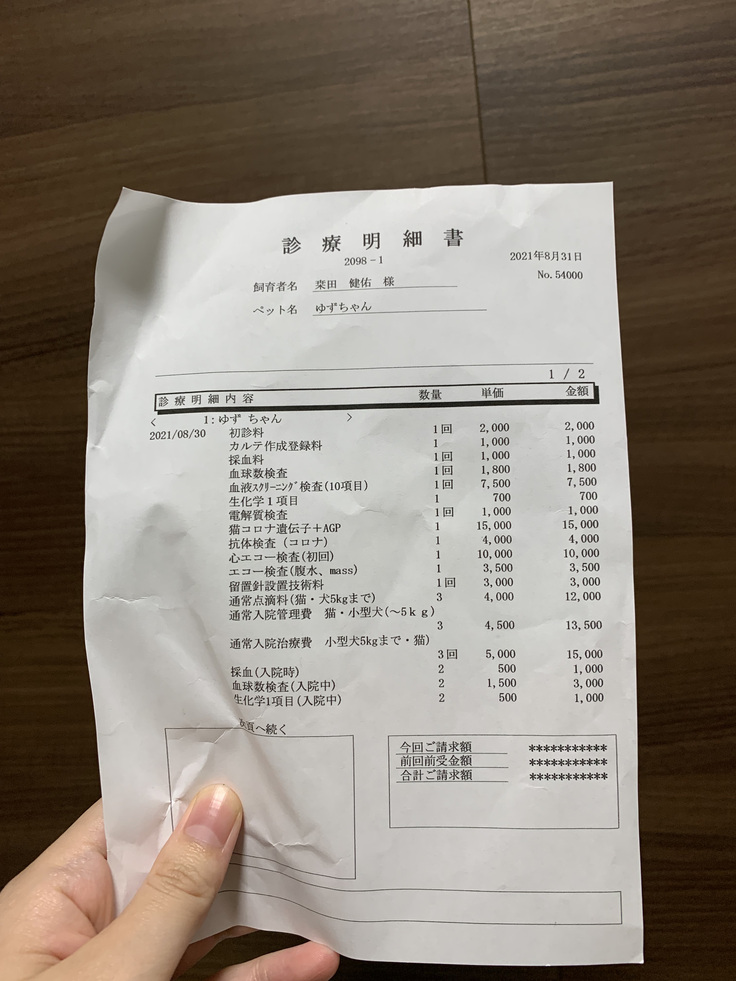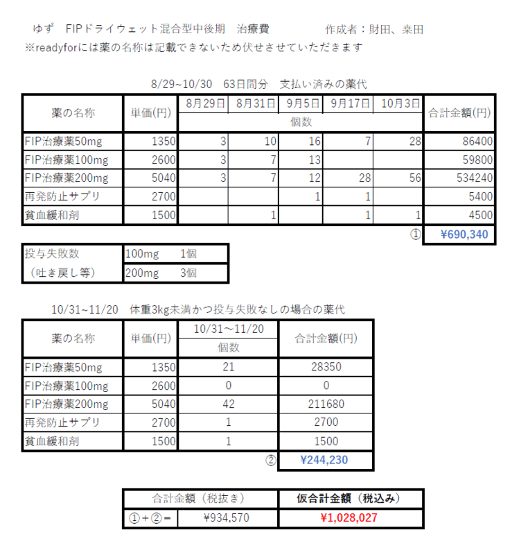 現在63日目までのFIP治療薬の代金として69万340円の支払いが済んでおり、残りの21日分のお薬代を合わせると、通院費抜きのお薬代だけで最低102万8027円かかる予定です。