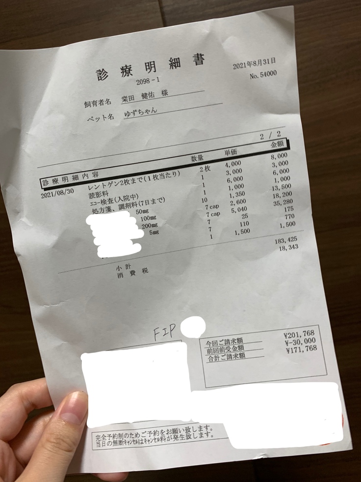 ゆずちゃんのFIP治療費(お薬代、入院費)