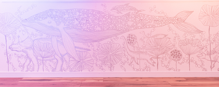 昨年、都内の某マンションの一室で、おおばあつこさんは、部屋一杯に、真夏の暑い日、何日も何時間もかけて絵を描いたそうです。私はその部屋を見せてもらい、壁画を撮影させてもらいました。その後、あつこさんには私の写真の活動についてお話をさせていただく機会が増え、今回のクラファンも企画段階から相談させてもらいました。おおばあつこさんが描いた壁画のクジラを見て、奄美のクジラへの想いを膨らませていたので、今回トートバッグとポストカードへのデザインを提供していただけることになり、とても嬉しく思っています。