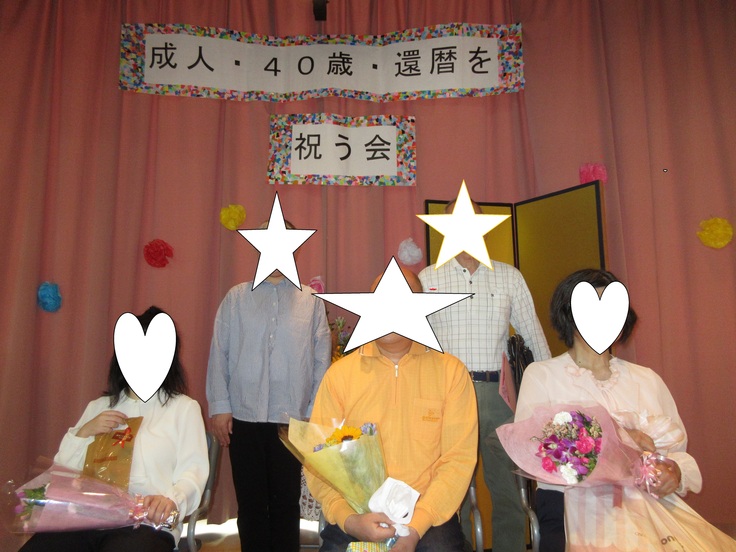 還暦のNさんは行事後に笑顔で出勤され、みんなに自分の生い立ちを見て欲しい、と当日休みだった職員に「みせてもらって、当日ビデオ撮ってもらっているから」と嬉しそうに当日の話をしてくれていました。