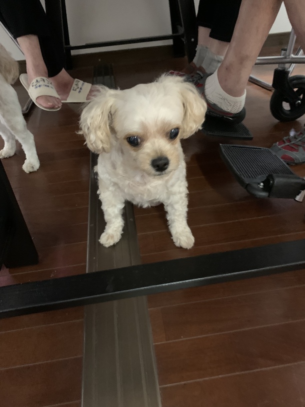 テーブルの下でリビングにやって来る入居者さんを朝のお出迎えをします。言葉は話せませんが入居者さん一人一人に【おはようございます】と言っているように待っています…入居者さんは笑顔になって