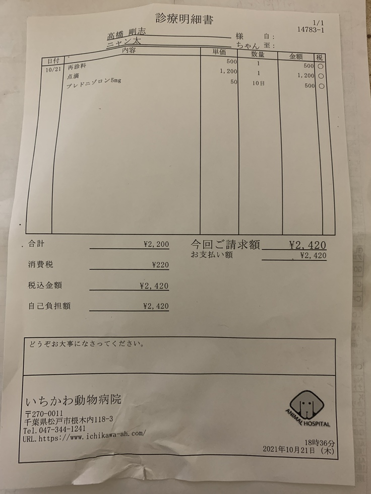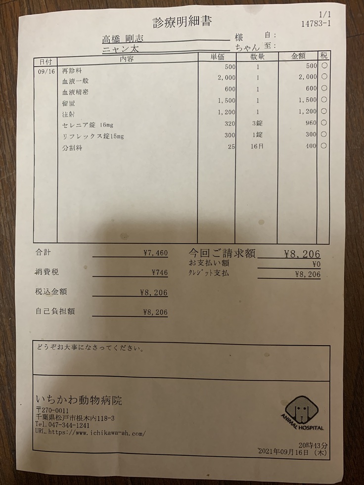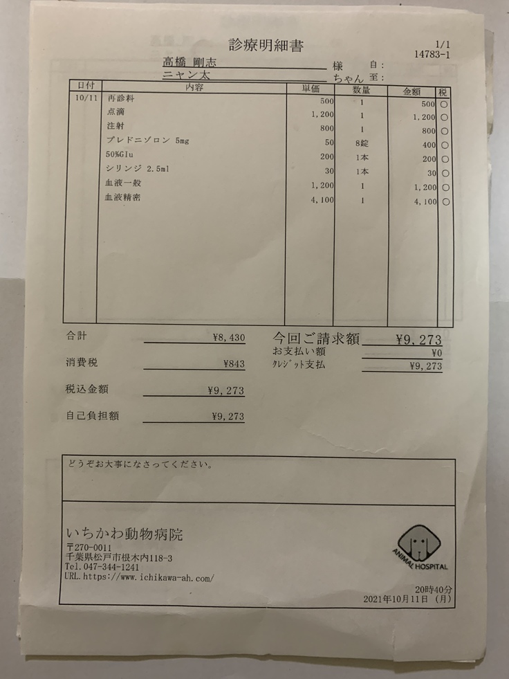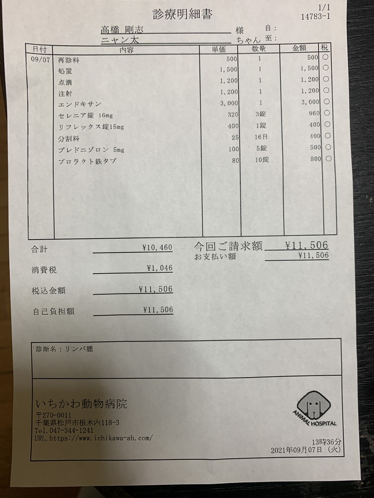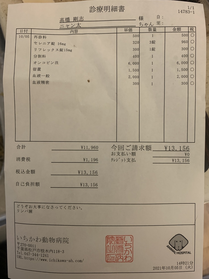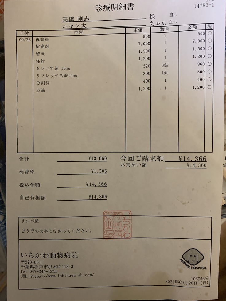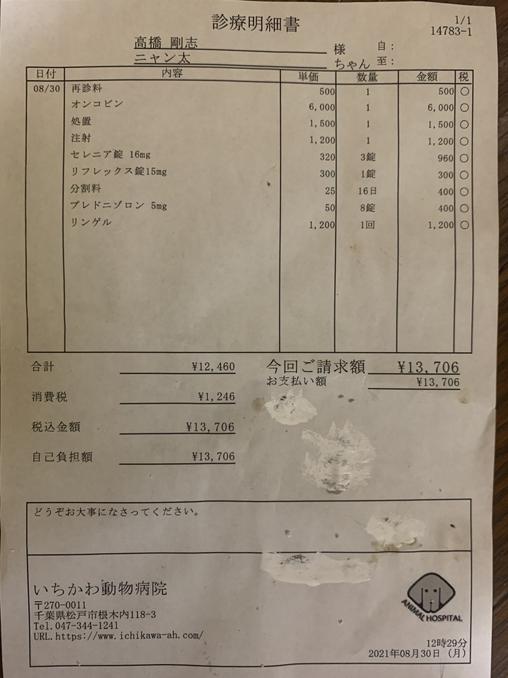 前述の通り動物病院の話では、抗がん剤治療には半年でおおむね25~30万円ほどかかるとのですが、それに満たない金額で半年が経過した場合、半年以降の治療費に充当させていただきます。