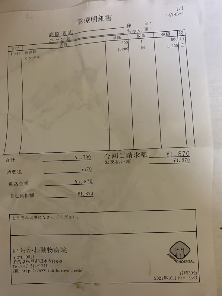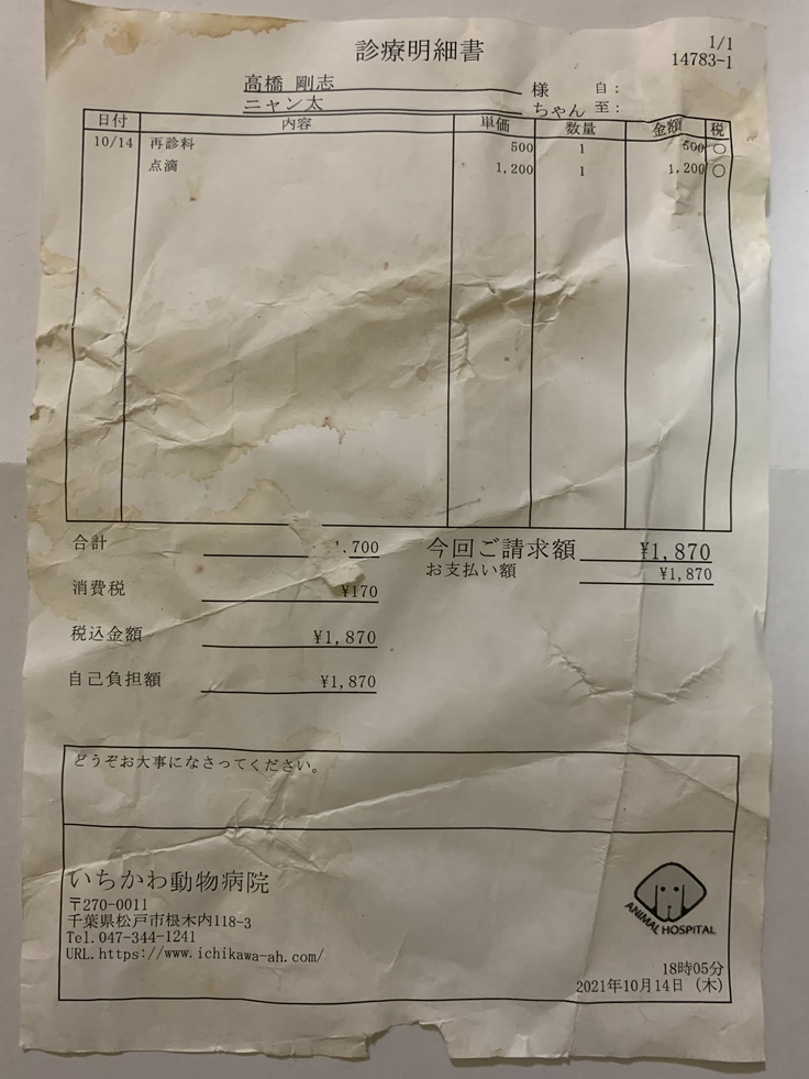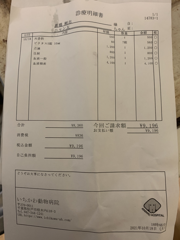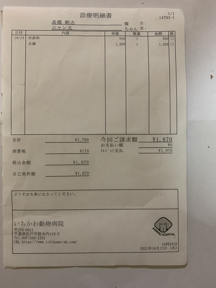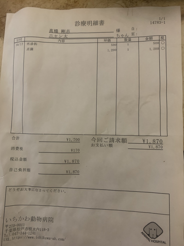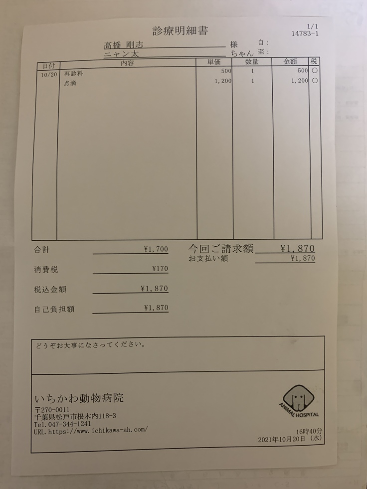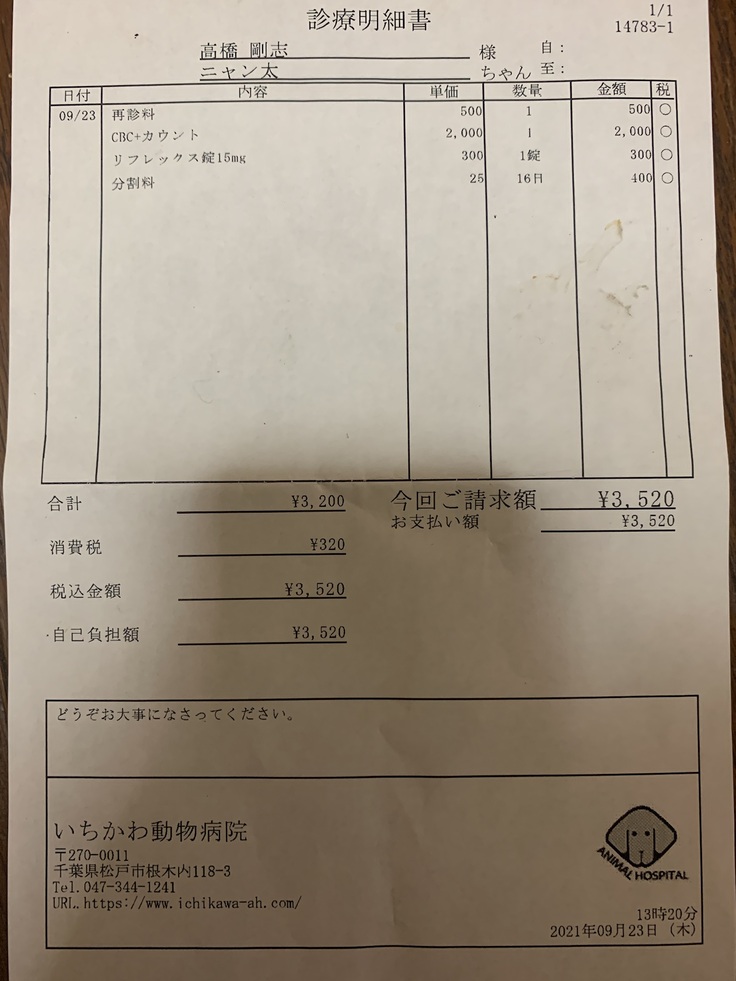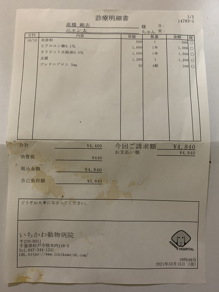 前述の通り動物病院の話では、抗がん剤治療には半年でおおむね25~30万円ほどかかるとのですが、それに満たない金額で半年が経過した場合、半年以降の治療費に充当させていただきます。