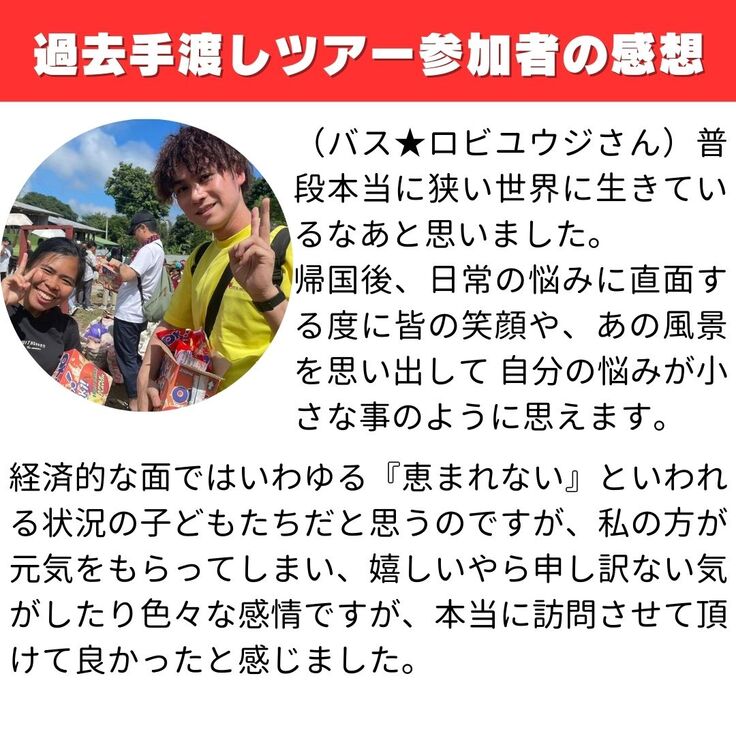 SBボランティアと一緒に手渡しツアーにご参加いただける寄附金100,000円のプランです。(※上記の寄付金にプラスして、航空券代、宿泊代は別途ご自身での手配となります。)