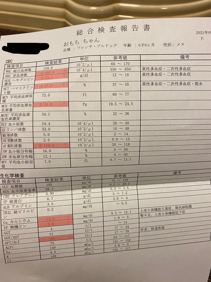 低酸素の状態が続いた為、多血症も併発しております。