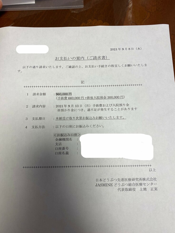 今までの医療費、手術請求書今後かかるものです。◆手術費用96万円(手術66万+入院費30万)◆これまでの検査費用・内服薬 11万円◆酸素濃縮器 5万円◆酸素缶 1万円◆術後の検査代・薬代 (術後になってみないと正確にはわかりませんが10万以上はかかります。入院が長引いたら1日に数万円追加されます)◆Ready For 手数料 集まった金額の12%(10万~程度)+税金10% ◆リターン費用 ◆早期入金手数料3万 合計 150万~