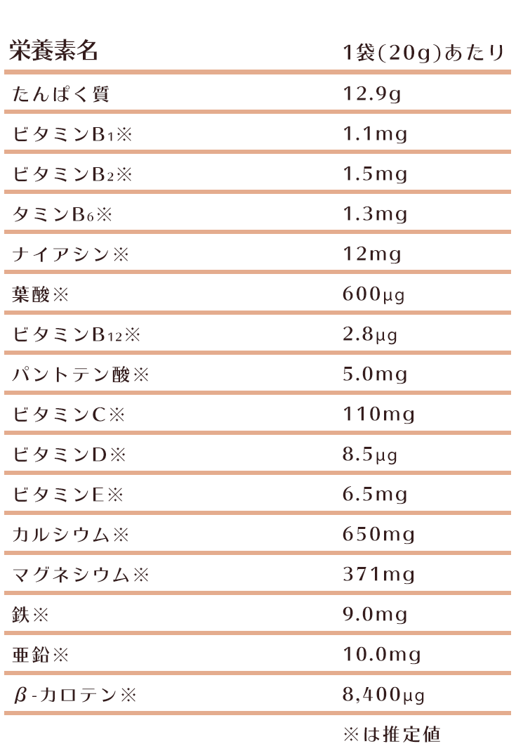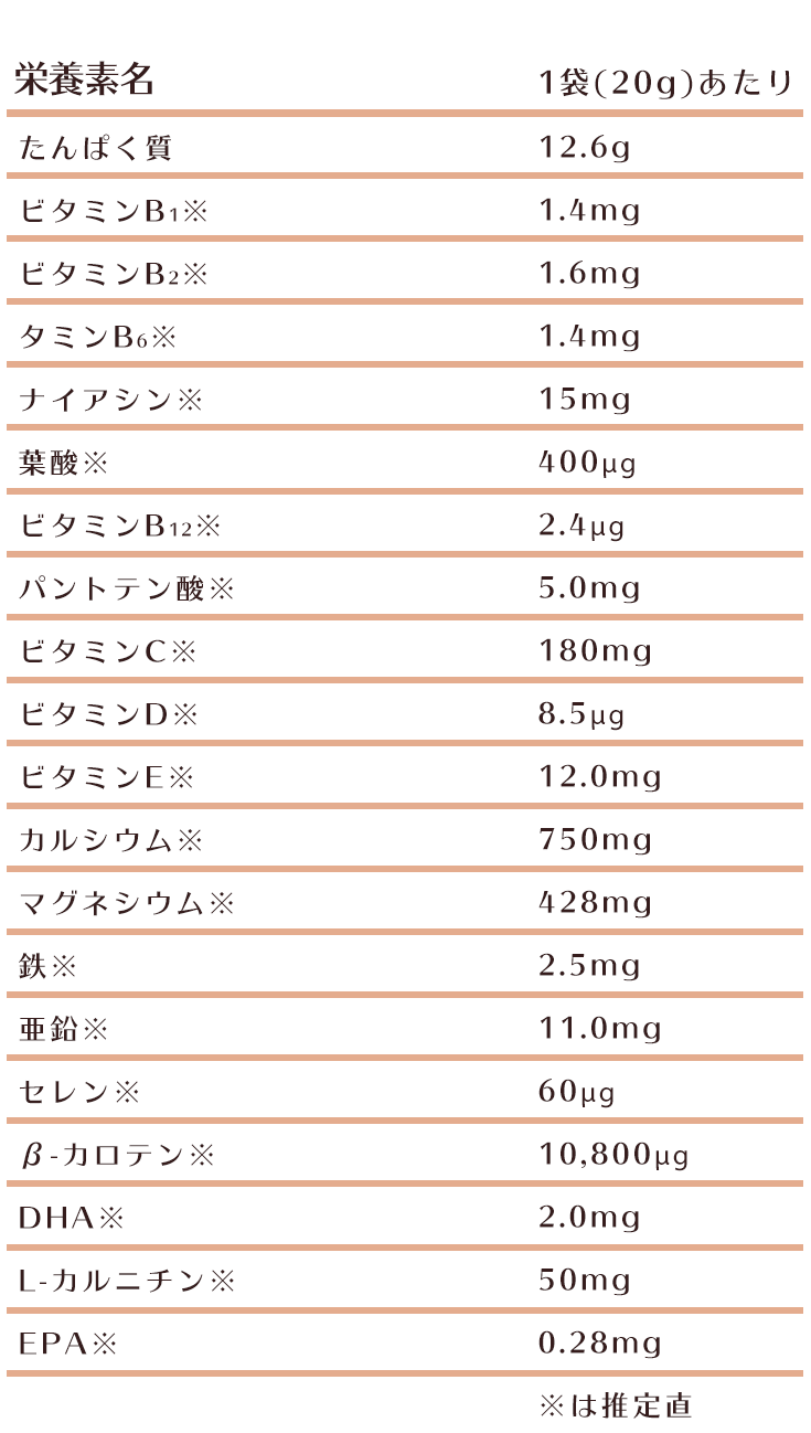 妊娠に必要とされる栄養素だけではなく「不足しがちな栄養素を忙しい人でもきちんと摂れるようにしたい」という最初の思いから、妊娠に推奨されている栄養素以外も盛り込むことにしました。