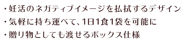 また、気軽にオシャレに妊活してもらいたいという想いからパッケージにもこだわりました。こだわった点は3点です。