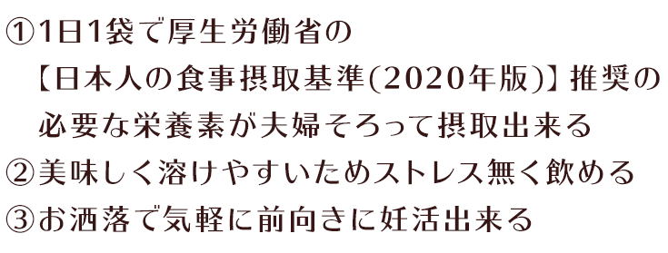 当商品は妊娠をお約束出来る商品ではございません。あくまでも妊娠をサポートするために必要な栄養を厚生労働省の【日本人の食事摂取基準(2020年版)】を基に配合した栄養プロテインです。