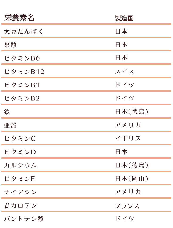 国産のカルシウムやビタミンなど、皆様が安心して飲んでいただけるように栄養素それぞれの製造国も調べ、厳選しました。