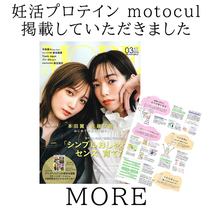 皆様に応援していただき無事に発売できた妊活プロテイン motocul があの人気雑誌『MORE』の3月号に掲載されました。