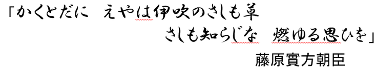(現代訳:せめて、こんなに私がお慕いしているとだけでも、あなたに言いたいのですが、言えません。伊吹山のさしも草ではないけれど、それほどまでとはご存じないでしょう。燃えるこの想いを。)