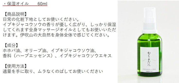 ●化粧水と保湿オイル、保湿クリーム、ハーブ石鹸、アルコール除菌ジェル(各1個)