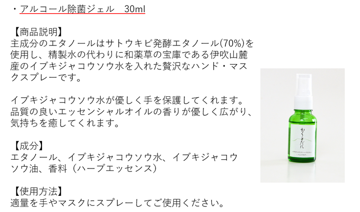 ※主成分エタノールはサトウキビ発酵エタノール(70%)を使用し精製水の代わりに伊吹山麓産イブキジャコウソウ水を使った贅沢なアルコール除菌ジェルです。