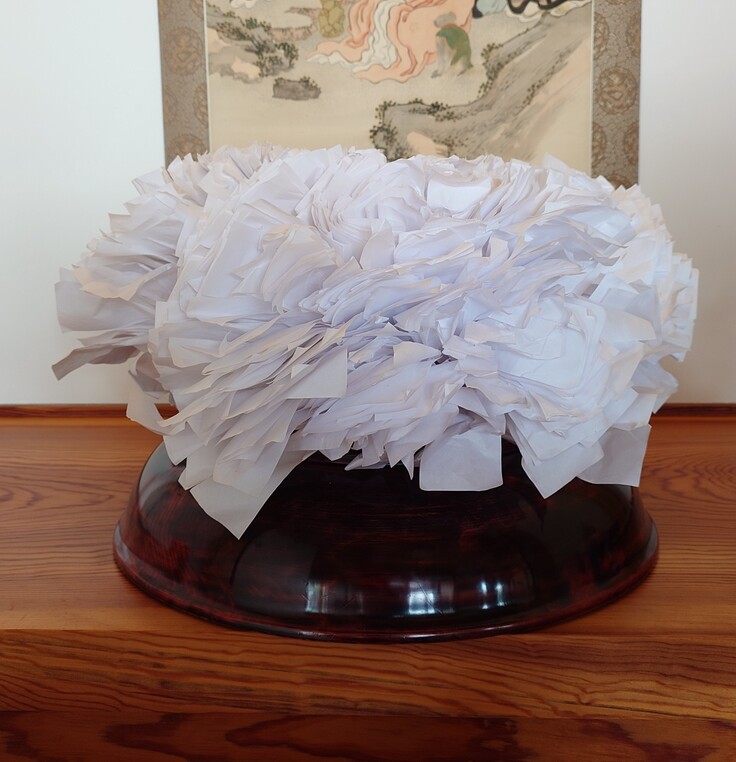 束ねた半紙に切れ込みを入れ、それをねじって1枚ずつさばき写真のように広げます。