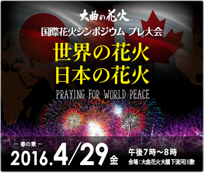 第16回「国際花火シンポジウム」実行委員会では、「第16回国際花火シンポジウム(2017年4月24日〜29日)」が大仙市大曲で開催されることを受け、来る2016年4月29日、国際花火シンポジウム プレ大会「世界の花火 日本の花火」(大曲の花火〜春の章〜)を開催いたします。