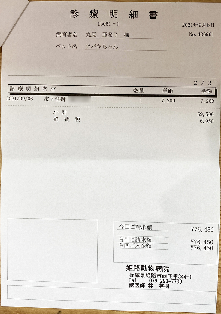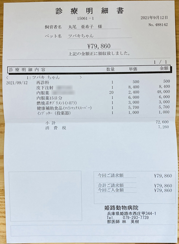 7日目の注射代、 自宅での投薬用の薬とサプリメントが79,860円でした。
