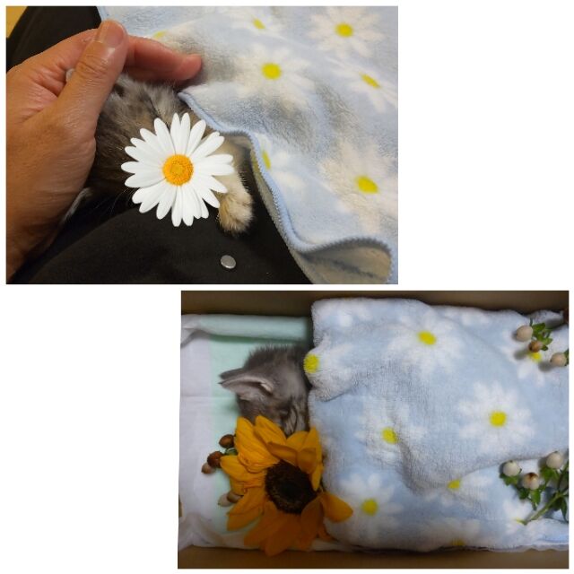 譲渡の際、ルカくんの里親さまに、いただいたお花で弔いをさせていただきました。