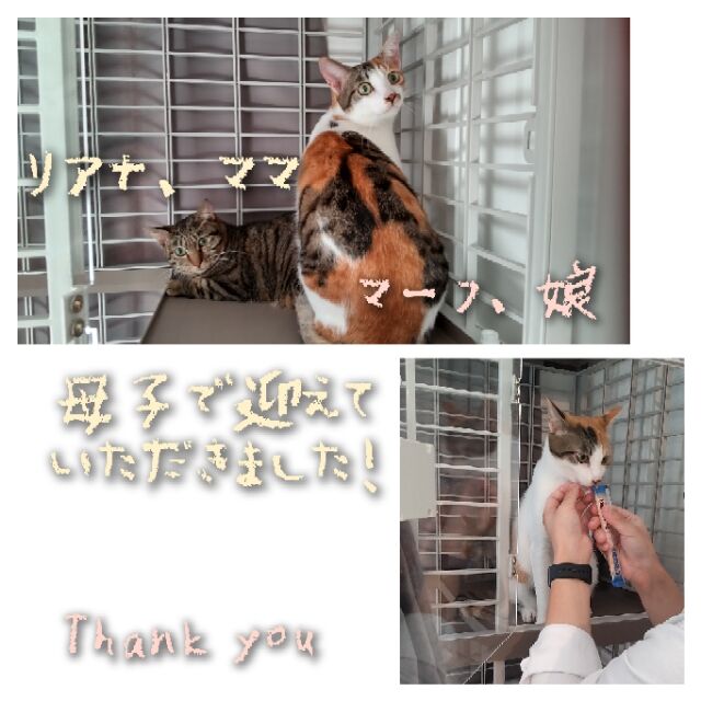 甘えん坊な母リアナと、天真爛漫な娘マーフ。愛らしい2匹はメンバーさんにも、よくかわいがっていただいていましたが、気づけば、娘のマーフは母より少し大きくなっていました。保護当初子猫だったマーフは、数回お見合いの話をいただきましたが、仲良しの母子を離したくなく、長くご縁をお待ちしていました。母と子供と離したくない…。活動者でもあり、母である私の思いを捨てるべきかと、悩んだこともありました。