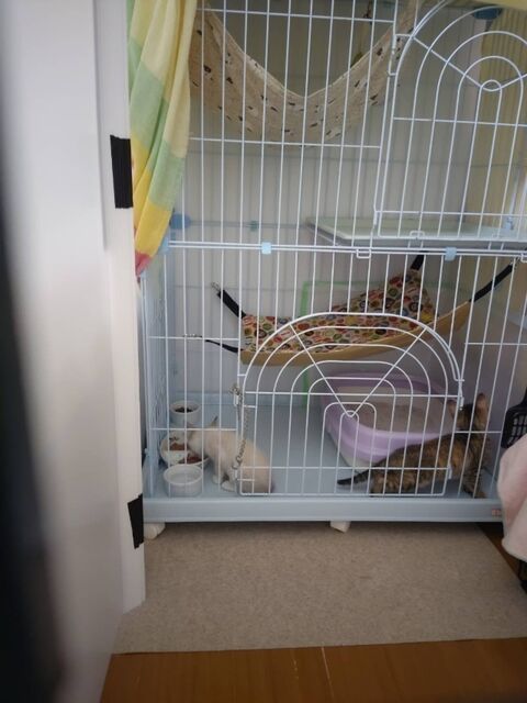 人が近くにいてもケージの外に出てくるように。びくびくはしているけど二人とも玩具にじゃれる。