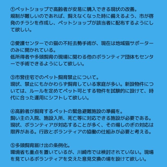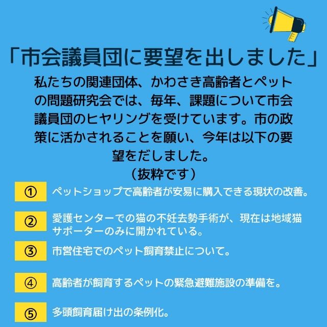 私たちの関連団体、かわさき高齢者とペットの問題研究会では、毎年、課題について市会議員団のヒヤリングを受けています。市の政策に活かされることを願い、今年は以下の要望をだしました。