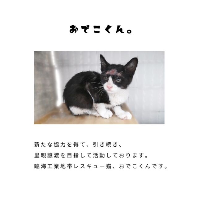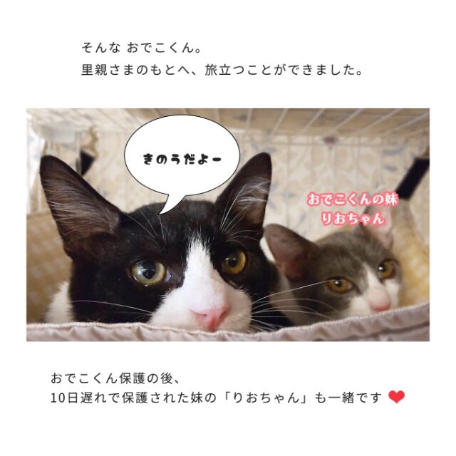 臨海工業地帯レスキュー猫、おでこくん改め、「エイトくん」と、妹の「りおちゃん」を新しいご家族に迎えていただきました。エイトくん、りおちゃんとってもステキなお名前をですね。里親さまは、姓名判断でお名前を贈ってくださったそうです。エイトくんのおでこの毛もキレイに生えそろいました。