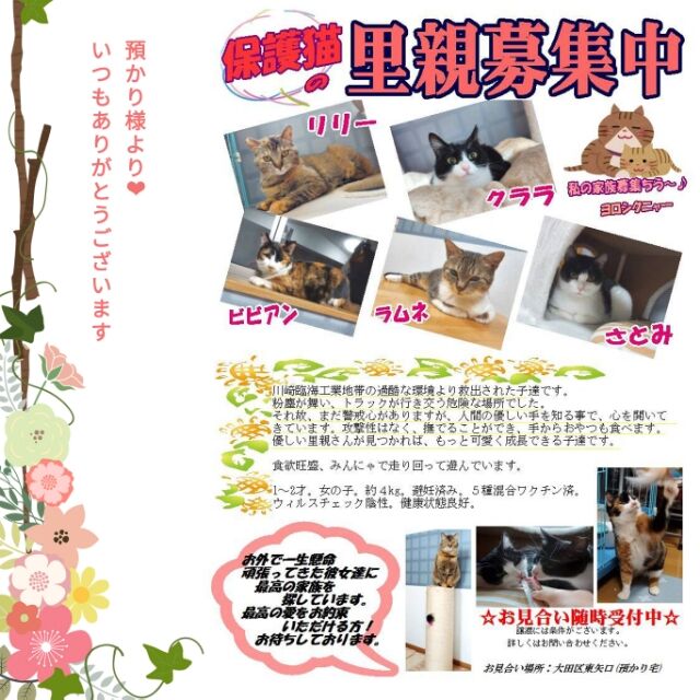 臨海工業地帯レスキュー猫預りさんの5匹の女の子も、毎回掲示させていただいています。