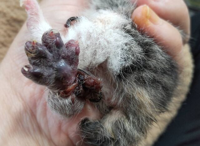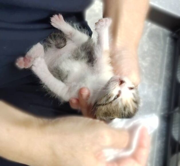 1匹の子猫をに異変を感じ、抱き上げると、その小さな足首にさい帯が巻き付いていました。