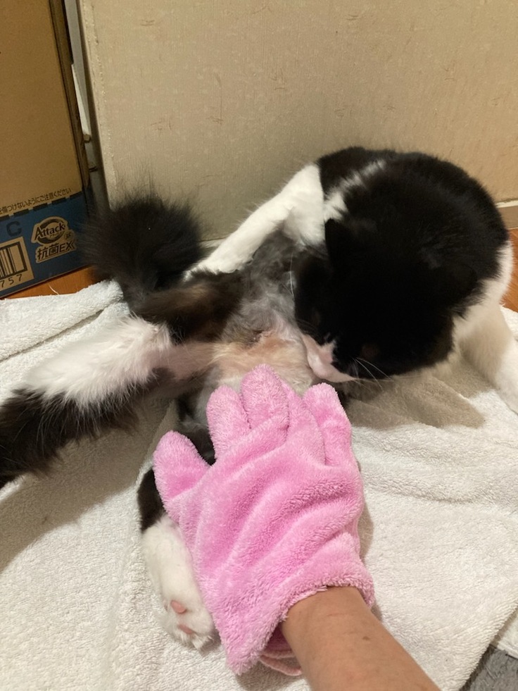 ハチも最近は自分からお風呂場に来て、洗った後は自分からタオルの上に行って舐めて綺麗にします。エライ!!