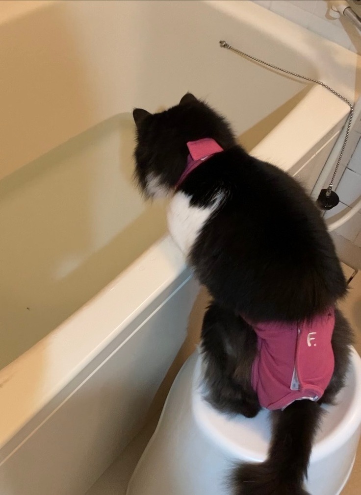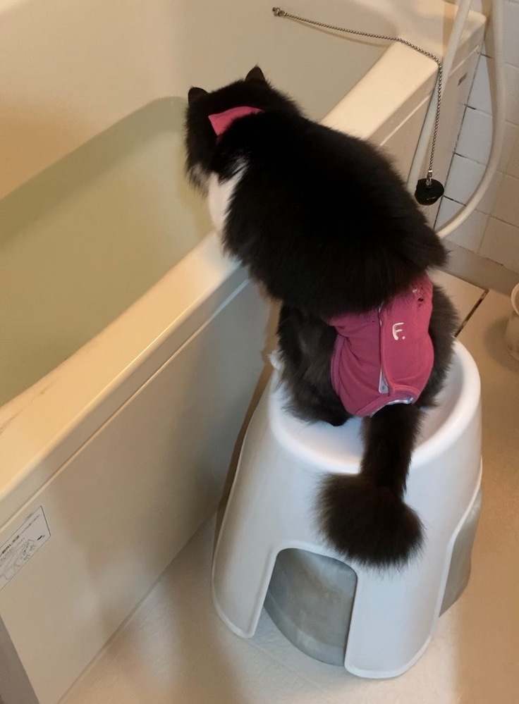 人間がお湯の中に浸かって気持ちよさげにしてるのが不思議そう。